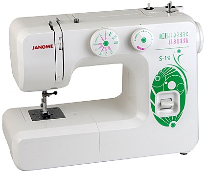 Электромеханическая швейная машина Janome S-19 обладает набором из 15 швейных операций, среди которых рабочие, трикотажные, оверлочные строчки и петля для пуговиц, которая выметывается без поворота ткани за 4 шага.