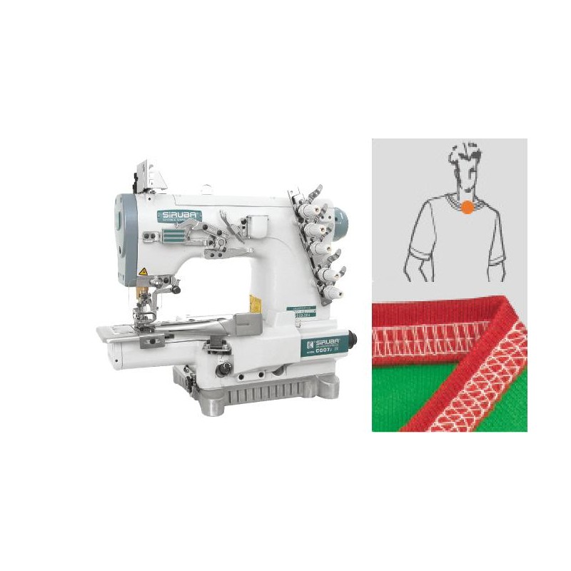 Siruba С007J-W222-356/CQ - 3-игл, 5 нит. Интерлок с устройством обработки бейкой края изделия цилиндрическая платформа, расстояние между иглами 5,6 мм, длина стежка 1,4-3,6мм, дифференциал до 2,9 мм, подъем лапки 5,0мм, скорость 6000 об/мин.