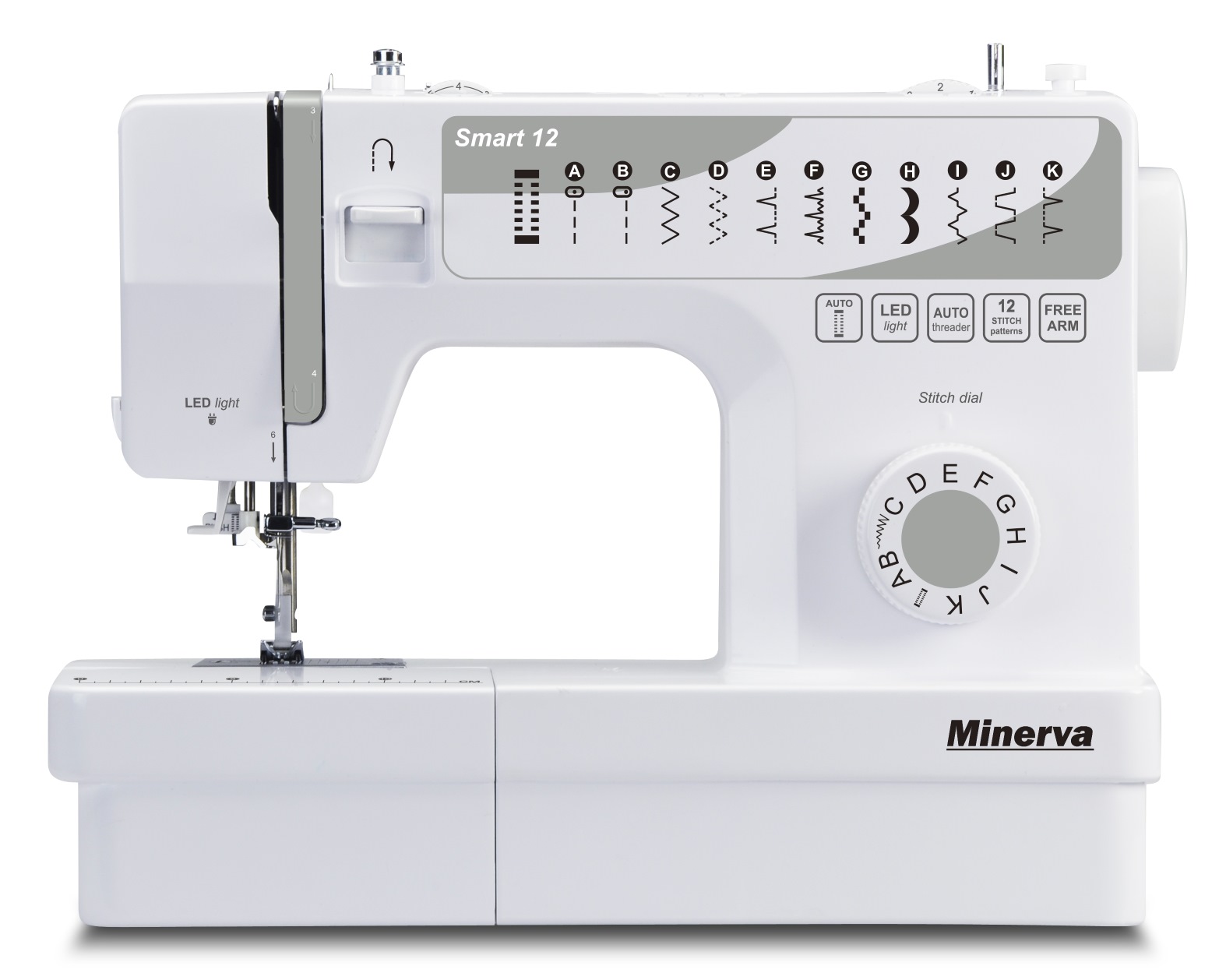 Minerva Smart 12 - удобная и стильная электромеханическая швейная машинка. Подходящий вариант, как для начинающих рукодельниц, так и для опытных мастериц, ведь она работает практически со всеми видами материалов. Приобретая эту умелицу вы получаете взамен 12 необходимых, базовых строчек и петлю, выметывающуюся в автоматическом режиме за 1 этап! На корпусе машинки удобно расположились указчик по строчкам, управление которыми происходит благодаря удобному вращающемуся диску и размеченную линейку для большей легкости в работе.