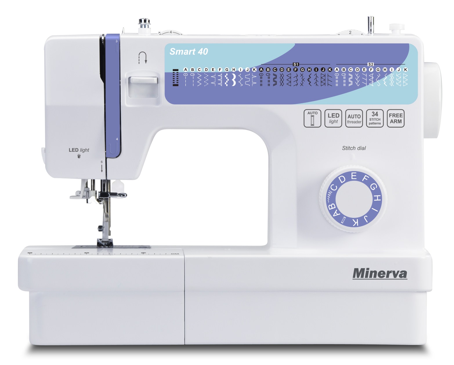 Minerva Smart 40 - электромеханическая швейная машина нового поколения. Отличный вариант, как для домашнего использования так и для небольших ателье, починки вещей или создания совершенно новых. Машинка работает практически со всеми типами тканей. В рабочий арсенал умелицы входит 34 вида операций (рабочая строчка, зигзагообразная, эластичная для трикотажа, несколько декоративных строчек и другие). Петля выметывается в один этап автоматически. Строчки удобно переключаются между собой благодаря установленному на корпусе вращающемуся диску. Также на панели машинки удобно расположился указчик по строчкам, а внизу размечена линейка для большего удобства в работе.
